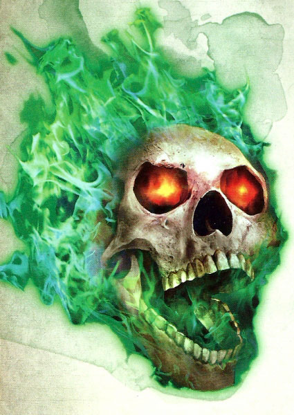 The thing retaliates by firing multiple rays of flame. The group withdraws to the corridor but this proves disastrous as the skull sends a fireball their way, catching them all in a tight space and causing much damage, enough to knock Hadron unconscious. In a rage Fallan rushes into the chamber to engage the thing in melee, while the others hang back and attempt to treat their wounds without a cleric. However things go from bad to worse: not only is Fallan unable to hit the skull because it flies out of his reach, but several of the dwarven corpses stand up and move to attack him while the skull hits him with a magic missile.